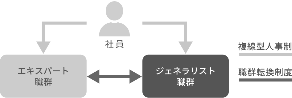 - 一定の職位に昇格した後、マネジメント・組織運営を担うジェネラリスト職群と、専門技能を培い現場で能力を発揮するエキスパート職群の二つの職群から、自身の意向とスキルに応じて選択が可能となっています。